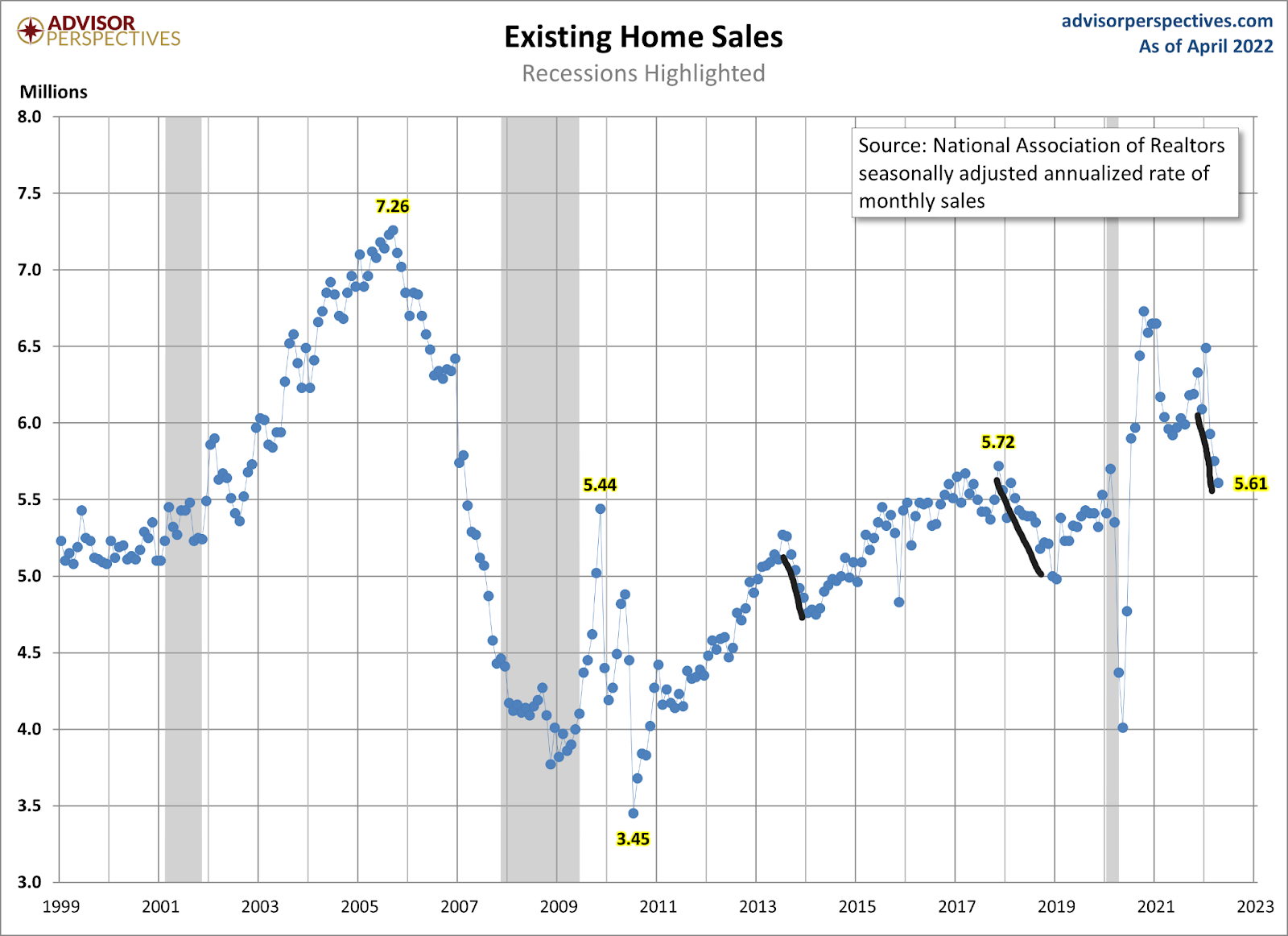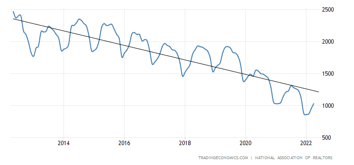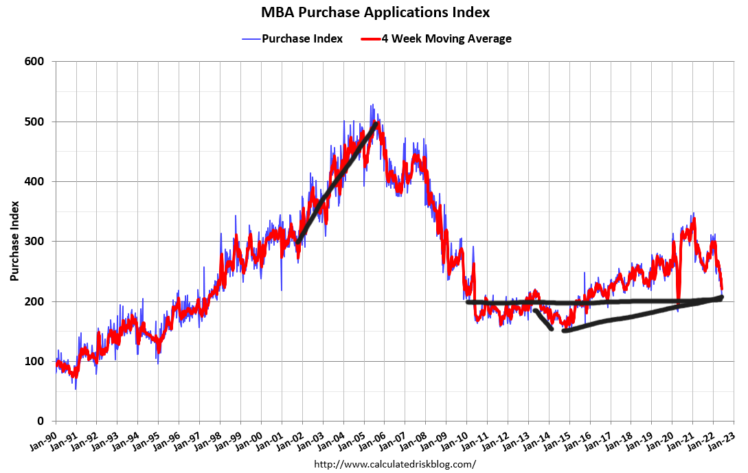 What this means is that home sales still have room to fall lower. Rising rates impact housing demand so sales can continue to fall as long as purchase application data is also falling on a year-over-year basis by double-digit percentages.