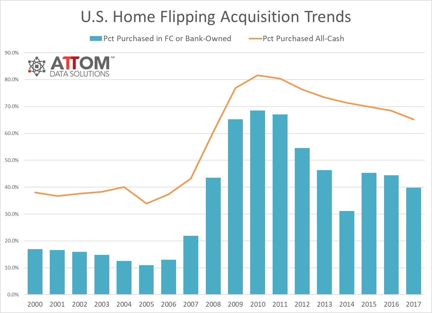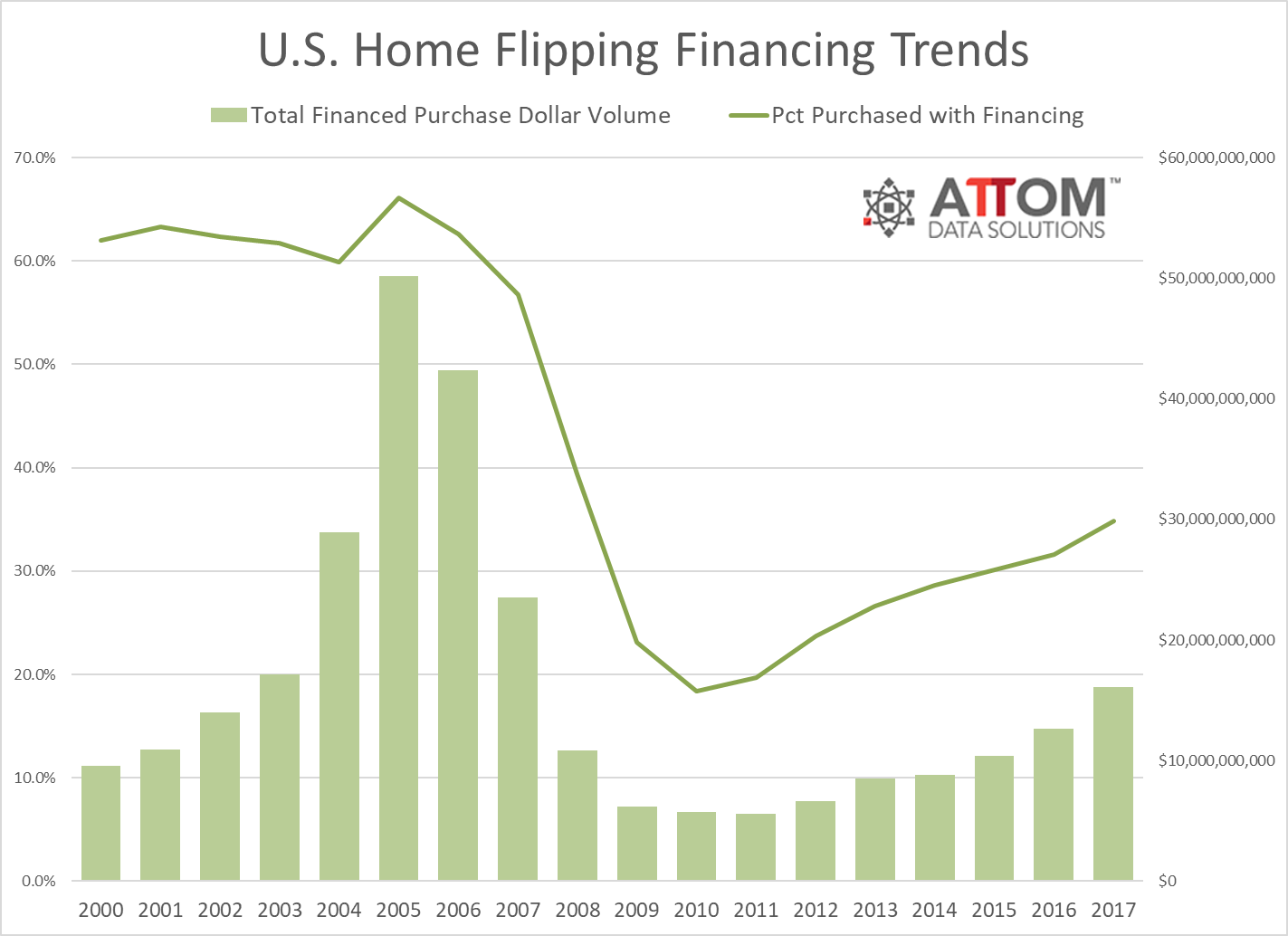 Flipped homes originally purchased by the investor with financing represented 34.8 percent of homes flipped in 2017, up from 31.6 percent in 2016 to the highest level since 2008 — a nine-year high.