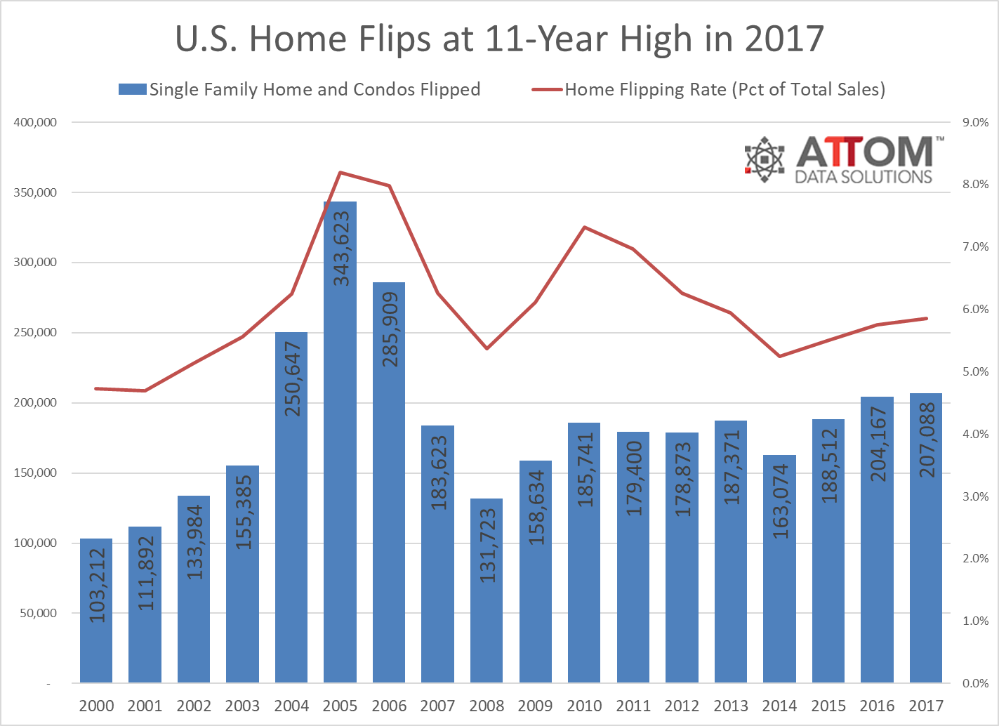 ATTOM Data Solutions, curator of the nation’s premier property database, today released its Q4 and Year-End 2017 U.S. Home Flipping Report, which shows that 207,088 U.S. single family homes and condos were flipped in 2017, up 1 percent from the 204,167 home flips in 2016 to the highest level since 2006 — an 11-year high.