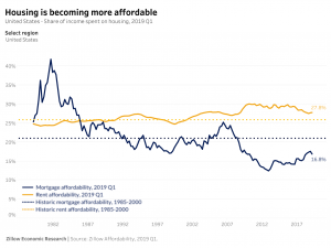 A recent study finds that median home prices have increased at four times the rate of household incomes since 1960. Another study finds the share of first-time homebuyers in the number of total sales has dropped from 50% in 2010 to 33% in 2018.