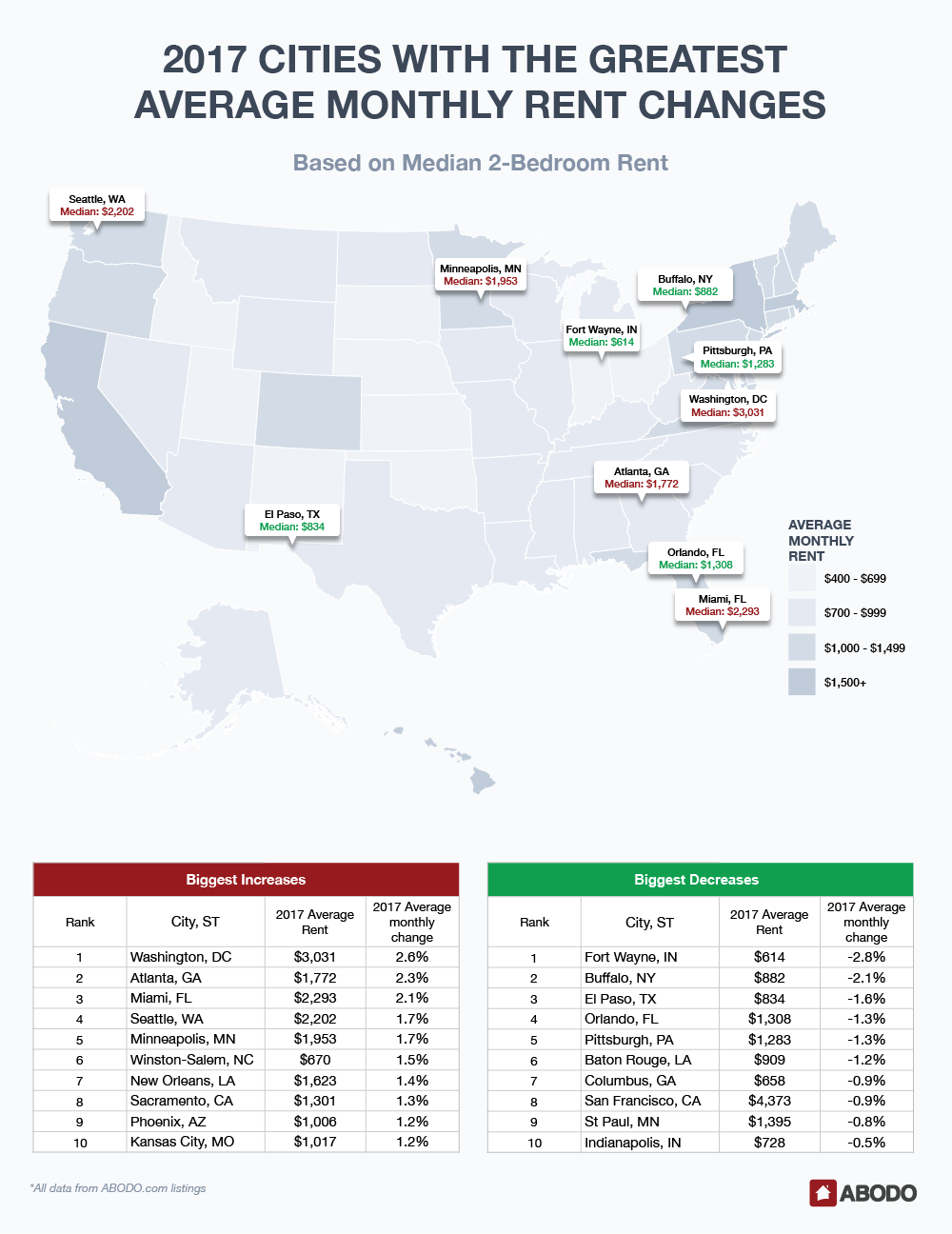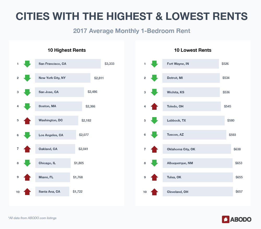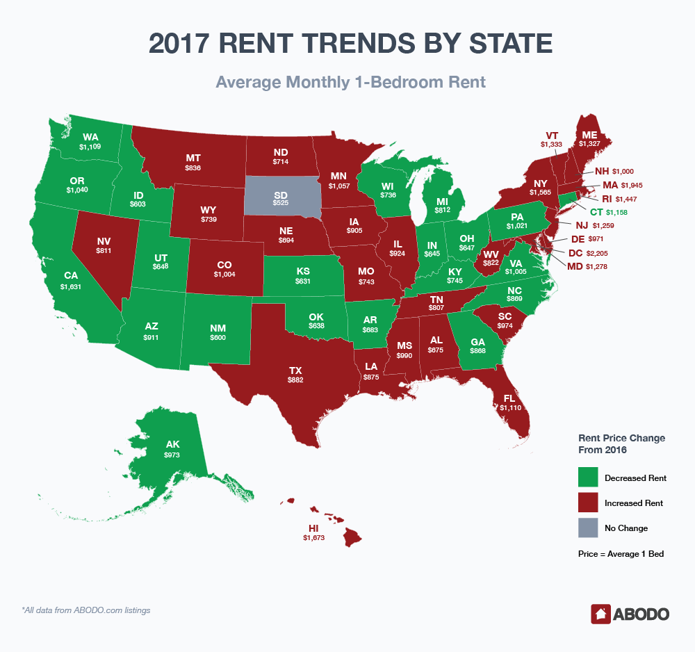 Each month, using over 1 million ABODO listings across the United States, we calculate the median 1-bedroom and 2-bedroom rent price by city, state, and nation and track the month-over-month percent change. For this report, we analyzed this data for the entire year of 2017 and found the average of the monthly percent changes in list price separately for each state and city. We also calculated the 2017 average list price in each state by taking the average of all monthly average list prices.